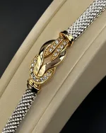 ویژگی | بند دستبند طرح جسیکا سفید و پلاک دستبند طرح فرد بینهایت نگین دار گلد می باشد .دستبند دارای قفل طوطی می باشد. |