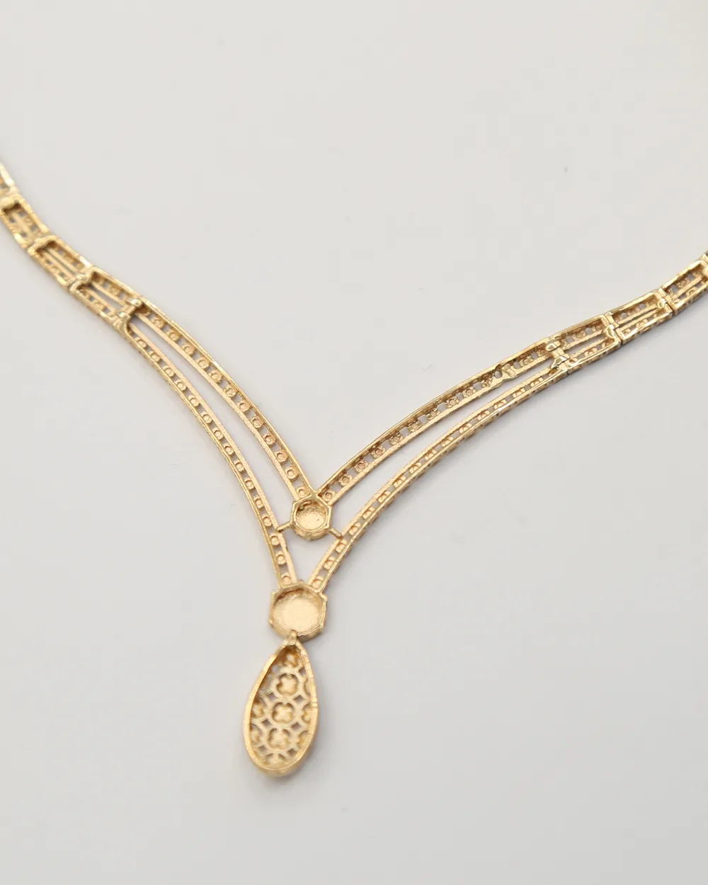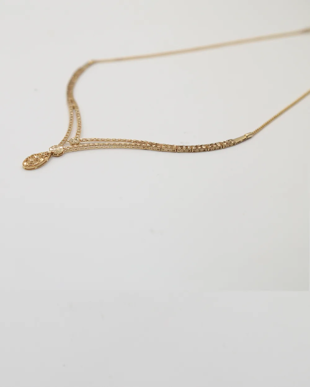 در طراحی گردنیند براین آویز اشکدر مرکز، دو جناقی و دانه های اتصال تراش دار به زنجیر جسیکا ظریف در نظر گرفته شده است.
